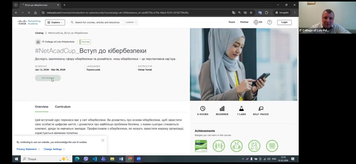 Під час презентації заступник директора з навчальної роботи ІТ коледжу Львівської політехніки п. Остап Юнак детально розповів про те як розпочати проходження онлайн-курсів на платформі Cisco Academy, про їх структуру, тривалість, які є доступні курси, зокрема з: