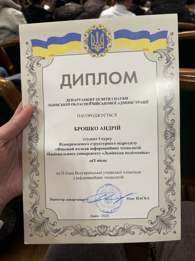 Щиро вітаємо здобувача освіти навчальної групи КІ-13 Брошко Андрія Михайловича (під керівництвом викладача Гошко Зіновія Олександрівна) із блискучою перемогою-дипломом І ступеня ІІ етапу Всеукраїнської учнівської олімпіади з інформаційних технологій у 2025/2026 навчальному році (наказ Департаменту освіти і науки Львівської обласної державної адміністрації № 02-01/01/19 від 22.01.2026 р. «Про підсумки проведення ІІ етапу Всеукраїнської учнівської олімпіади з інформаційних технологій у 2025/2026 навчальному році»).