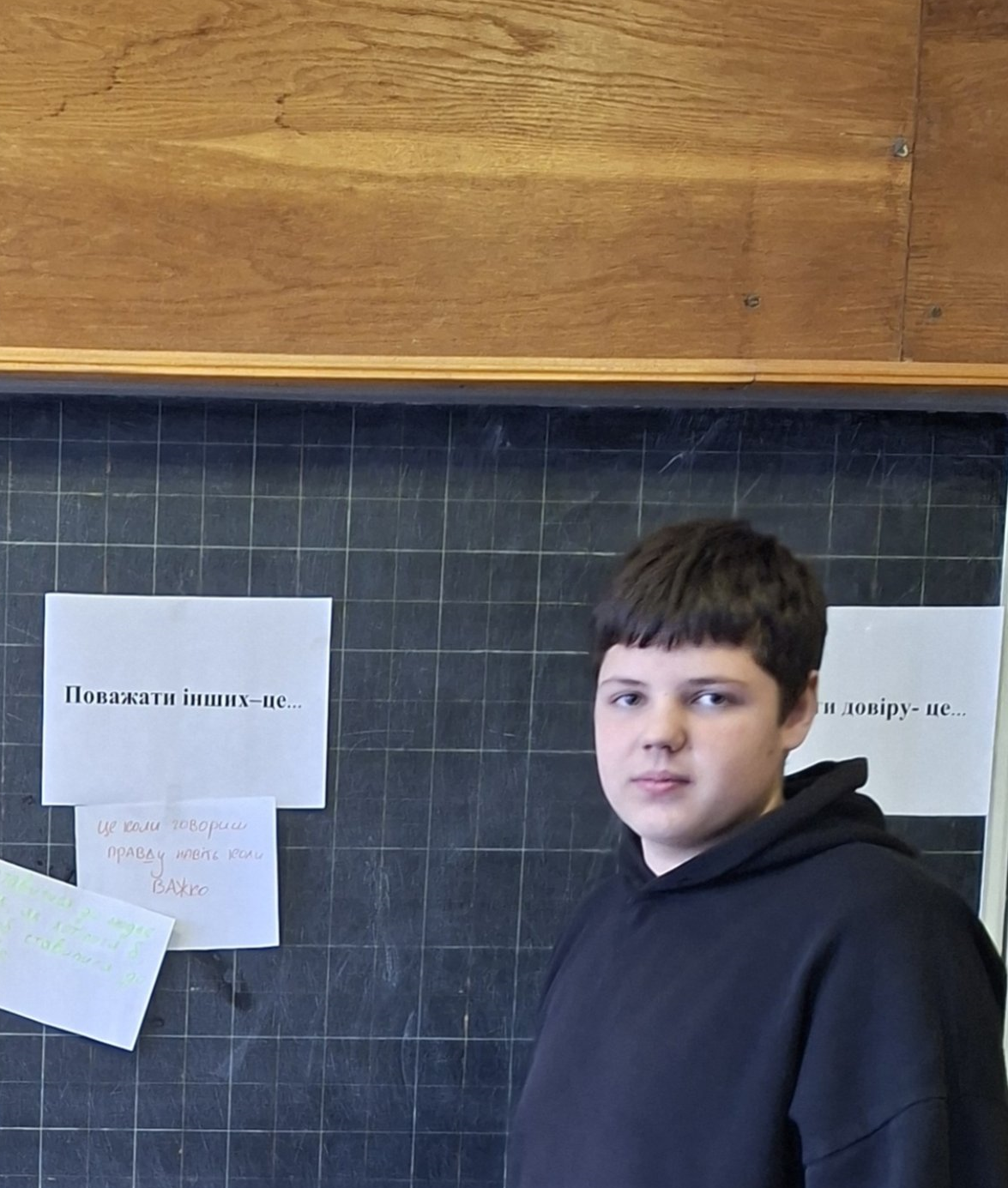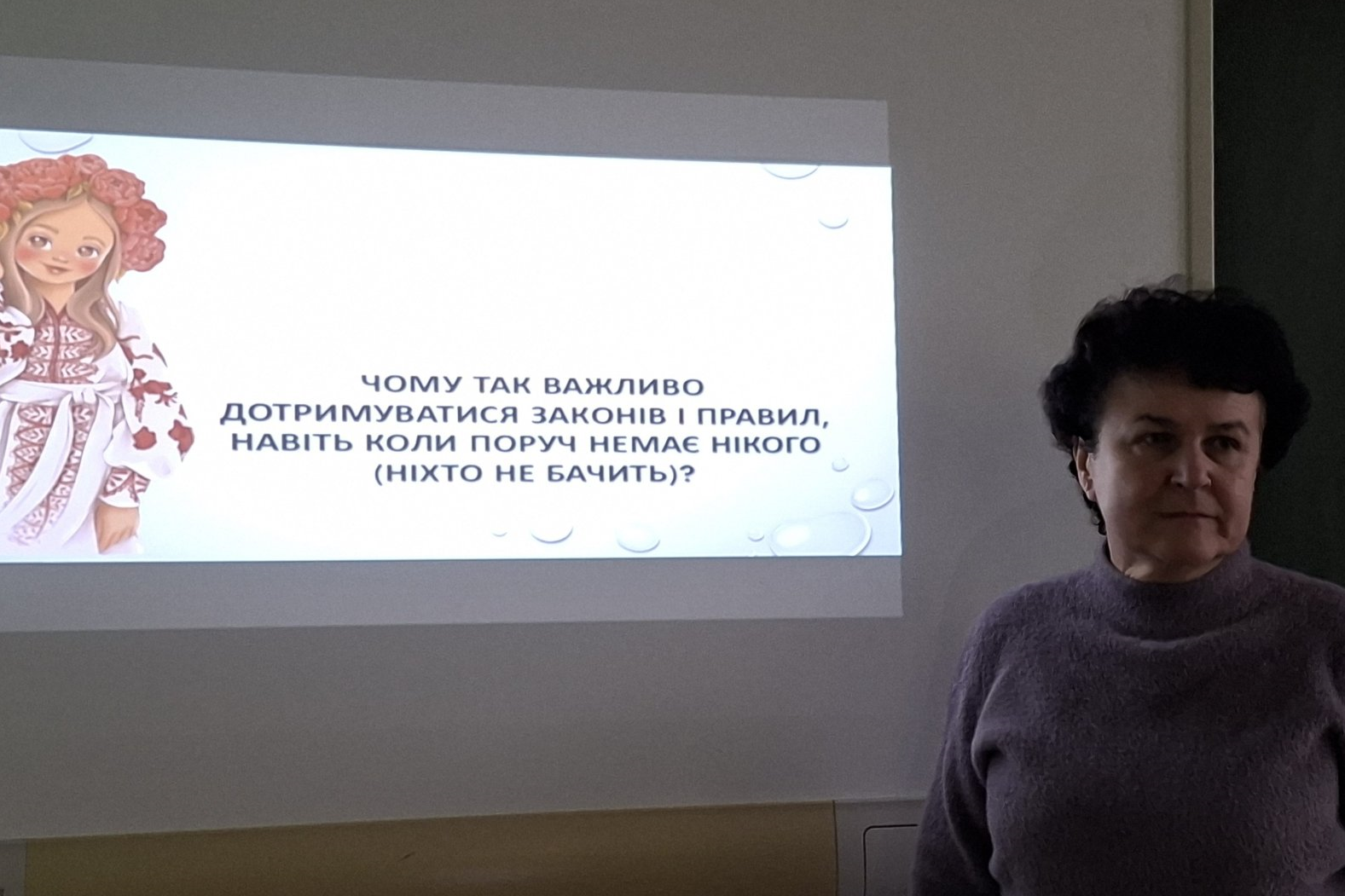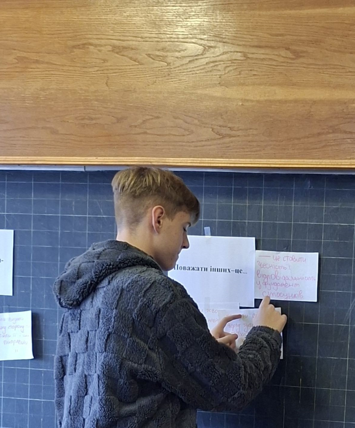 Під час обговорення студенти активно висловлювали власні думки, ділилися прикладами з повсякденного життя та спільно виконали інтерактивну вправу «Продовжи думку», яка допомогла глибше осмислити поняття доброчесності та справедливості.
