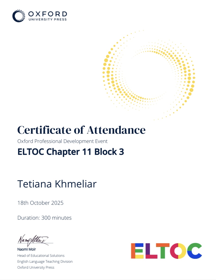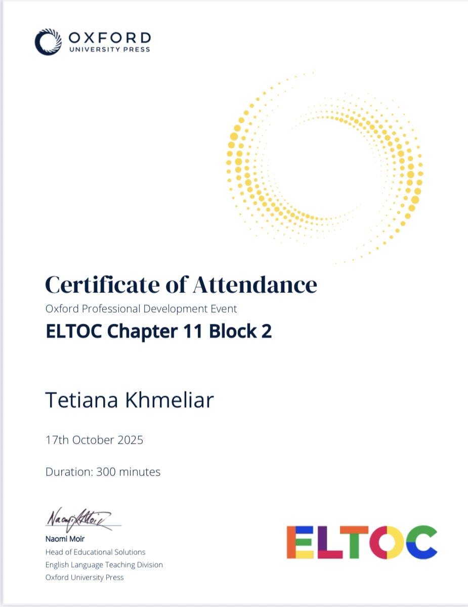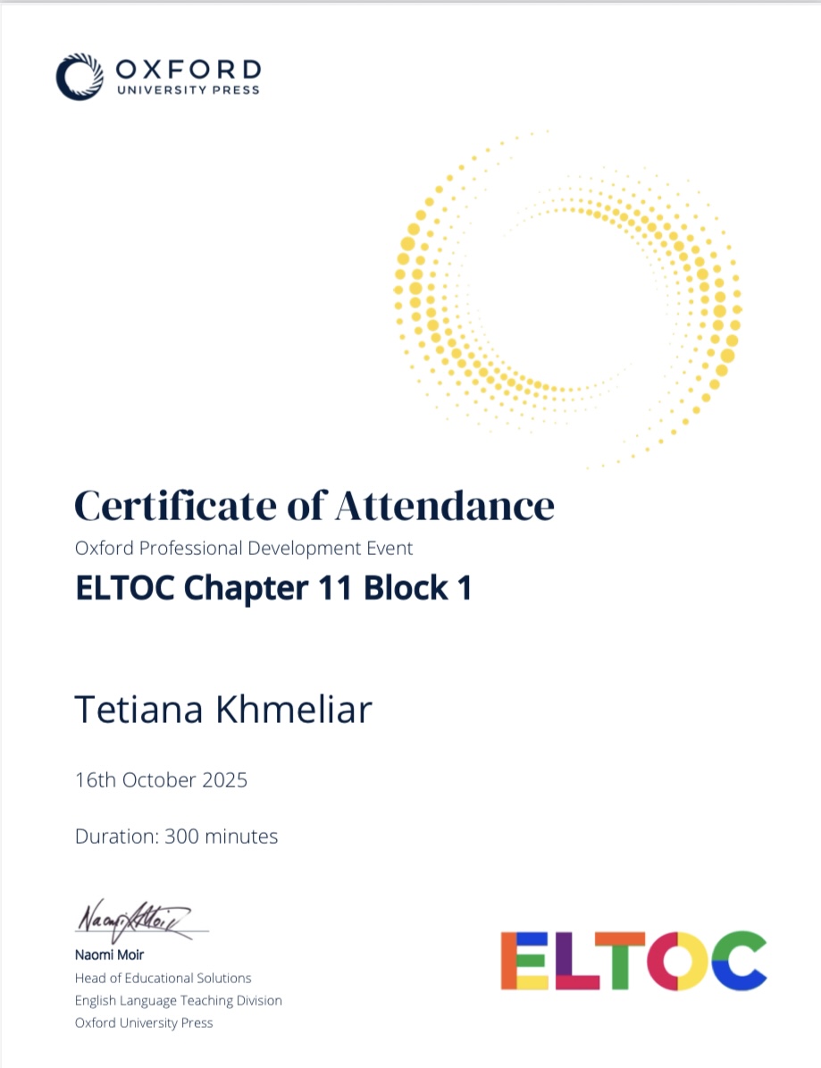 Викладач англійської мови Тетяна Хмеляр взяла участь у міжнародній онлайн-конференції ELTOC 2025 (English Language Teaching Online Conference), організованій видавництвом Oxford University Press. Подія об’єднала провідних експертів та викладачів з усього світу для обговорення сучасних тенденцій у навчанні англійської мови.